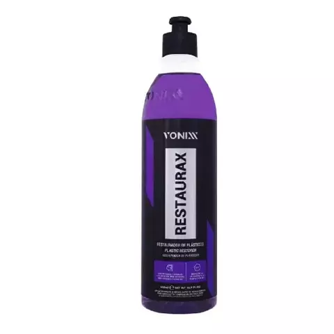 Restaurax renova e restaura superfícies plásticas, como para-choques, painés e laterais de portas. Sua fórmula contém polímeros especiais que também protegem as peças contra as ações do tempo, evitando degradação prococe do material Diluição Pronto uso Durabilidade: Até seis meses de proteção nos plásticos internos e sessenta dias nos plásticos externos Informações adicionais Restaurax também pode ser usado em capota marítima Não recomendamos o uso do produto em couro -Renova e dá brilho -Protege contra a ação do tempo -Contém polímeros de última geração Modo de usar Limpar bem a superfície e em seguida aplicar o produto com um aplicador de espuma até a completa restauração. Se necessário, repetir a operação. Para manter o plástico sempre novo, repetir a aplicação do produto a cada 60 dias na parte externa e a cada 6 meses na partee interna Obs: Para um resultado com menos brilho, realizar acabamento com uma microfibra